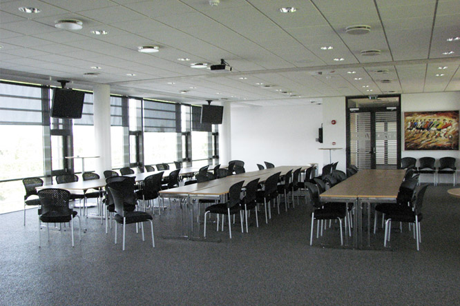 Í salnum er fullkomið hljóðkerfi fyrir tal og tónlist. Myndvarpi og flatskjáir til afnota ef þess þarf.