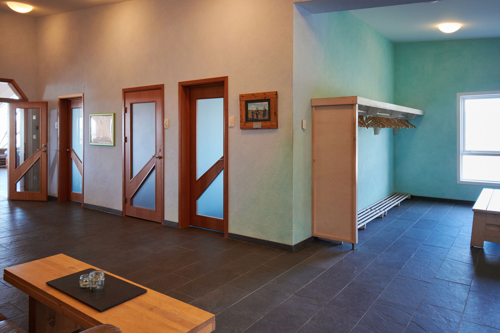 Í salnum er hljóðkerfi fyrir tal og tónlist. Sófahorn með þægilegum leðursófum. Myndvarpi og sýningartjald.